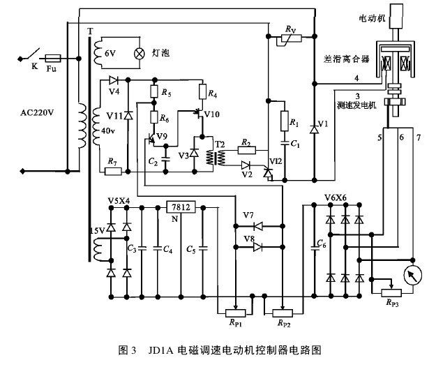 可控硅整流电路。该系统采用可控硅单相半波整流电路。整流电路的输出控制转差离合器的励磁线圈来产生励磁电流并最终影响电机的转速。图中1、1和热敏电阻V均对可控硅有过压保护作用。V1 为续流二极管,其作用是,正半周时由于可控硅导通而使离合器工作;负半周时可控硅不导通,励磁线圈产生的反向电动势可经过 V1 形成放电回路,使线圈中的电流连续,从而使离合器工作稳定。