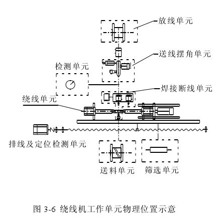 根据上节对绕线机系统功能的划分,系统在五个子系统之下,还分为若干个工作单元,这些单元相互协作实现绕线机的设计功能。绕线机各单元协同工作如图3-5所示,各单元物理位置如图3-6所示。