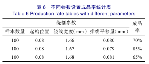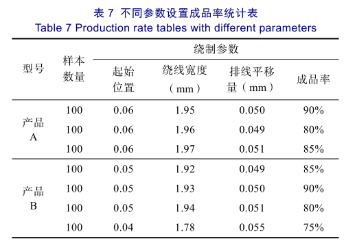 根据工装调试过程,对比每种漆包线成品率较高时的三组参数,如表7所示,最后选用成品率最高的参数设置。