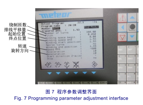 全自动绕线机绕制程序针对排线机构可以设置有起始位置,终点位置,排线平移量(漆包线线径相关)。针对绕线主轴主要包括转速、绕制匝数、旋转方向(正转或反转),程序界面如图7所示。起始位置与终点位置决定绕制线圈绕组宽度,排线平移量一般高于漆包线最大外径,具体设置参数依据不同型号绕线机略有不同,一般来说,此参数与漆包线最大外径越接近,排线越紧密。
