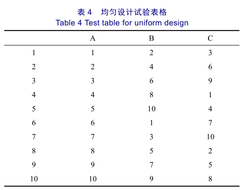 本试验采用十水平三因素的均匀设计试验,选取U10(108)均匀设计表作为试验用表。选择该表共需做10组试验。