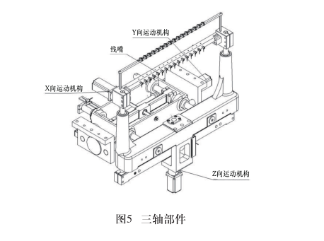 如图5所示,xyz三轴部件组成规范的三坐标伺服系统,使得线嘴可以在有效行程内自由移动,可以根据程序自动进行缠绕等动作。本机构设置于大板下方,使得设备易于维护,外观简洁。