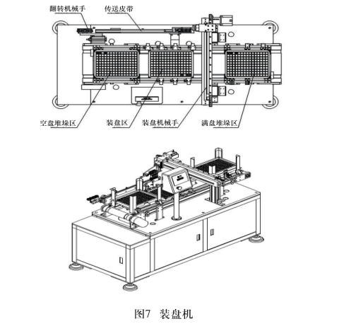 线圈料盘通过堆垛方式,皮带自动传送。人工将一堆空料盘放于空盘堆垛区,通过气缸动作将堆垛区空盘取出并置于料盘传送皮带上,通过气缸限制定位料盘准确停于预定装盘位置,等待机械手把线圈骨架抓入。料盘装满后气缸限制定位机构自动放开,料盘自动流致满料堆垛区,自动堆垛,至此完成全自动线圈骨架的一个生产周期。