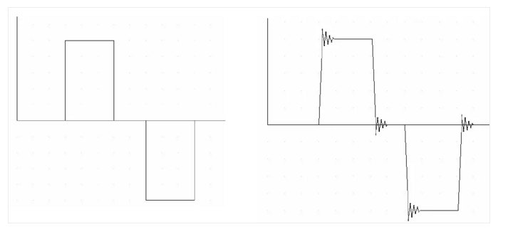 由于原边及幅边漏感,电阻分量的存在,脉冲在经过变压器后,产生延迟、斜率变缓、振铃、顶降