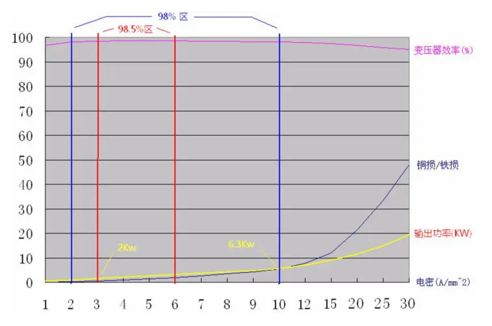 将一个EE85 磁芯,在2000GS 磁密,25KHz 频率下,不同电流密度时的效率、输出功率,铜损铁损比绘在同一表格内(注意:因为宽度不够,电流密度在10 以上比例不同。)可以发现,电流密度在3-6A/mm2 范围内,变压器效率达到98.5%以上,而要满足98%的效率,电流密度的范围达到2-10A/mm2。