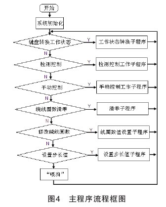 它包括八个部分:系统初始化、转换工作状态判断、检测控制判断、手动控制判断、绕线圈数清零判断、修改绕线圈数判断、设置步长值判断和“喂狗”等。