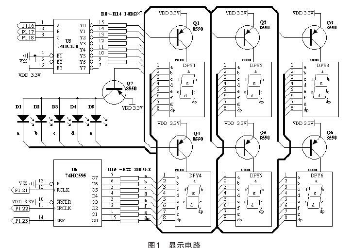 数值(字)显示电路,它由芯片US和U6、限流电阻R8~R13和R15~R22、三极管Q1~Q6,数码管DPY1~DPY6组成。74HC138是三/八译码器,与LPC2132的P1.16~P1.18端口相连,实现数码管的位选。74HC595有8位移位寄存器和一个存储器,具有三态输出功能。它与LPC2132的P1.21~P1.23端口相连,实现数码管的段选。LED为共阳极数码管,型号是LN3161BS。数值(字)显示电路的主要功能是在不同的工作状态下,实现对应(各种)的数值(字)显示。它们分别是累计的圈数值、修改的参数值。