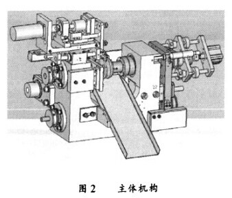 该绕线机工作原理是:漆包线从原料桶出来,经过张力机构后,线保持恒定的张力,然后通过排线机构的导线轮,再到减压线机构的压线柱下。绕线机构和排线机构协同动作,即绕线机构每旋转1周,排线机构带动漆包线移动1个线径的距离,从而实现整齐精密排线。同时加热机构对漆包线和磨具进行加热,使漆包线一绕到磨具匕就能粘结在一起。当绕完一个线圈时,减压线机构把漆包线剪断的同时另一端又被压倒,然后把线圈卸载。周而复始,实现全自动排线。主体机构见图2。