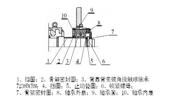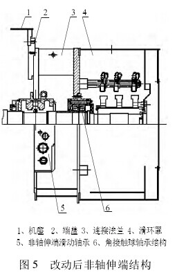 绕线机轴伸端和非轴伸端仍采用滑动轴承,在滑环罩与法兰连接处背靠背安装一对角接触轴承,同时对滑动轴承的密封方式进行改进。利用绕线式绕线机滑环罩通过连接法兰与绕线机非轴伸端的端盖连接的结构特点,取消盖板,在滑环罩与法兰连接的端板上安装轴承套,背对背安装一对角接触球轴承,绕线机主轴承仍采用端盖式滑动轴承。