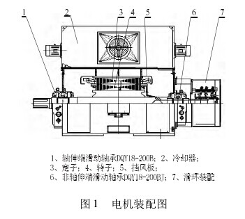 端盖式滑动轴承的润滑方式为稀油润滑,绕线机运行时,复合润滑供油系统供油压力为0.01~0.06MPa,流量4~10L,润滑油进油温度保证在30℃~40℃。供油系统向滑动轴承内供油,油环旋转使轴与滑动轴承的轴瓦间隙内形成油膜,油膜产生一定的压力,使轴悬浮在滑动轴承的轴瓦中间,轴与轴瓦没有接触点,因而就没有摩擦,绕线机运行平稳,滑动轴承温升低,工作时间长。采用滑动轴承的绕线机工作时必须水平放置,与水平面不能有倾斜角,否则转子在绕线机径向力作用下发生倾斜,造成轴瓦与轴接触摩擦,滑动轴承温升急剧升高,将轴瓦毁坏,绕线机无法运行;同时绕线机倾斜很容易造成滑动轴承漏油、渗油的质量事故。
